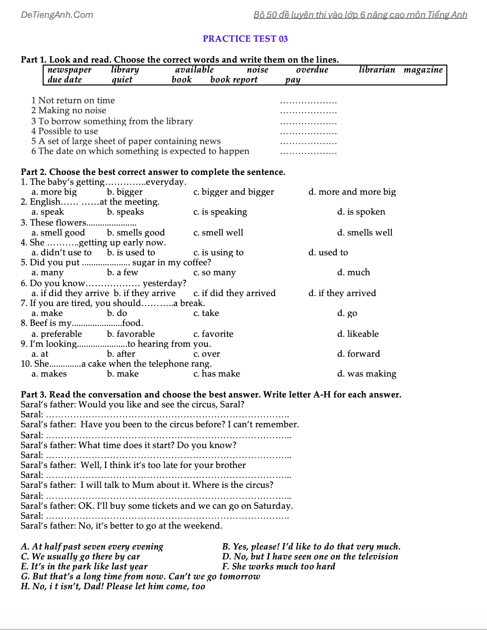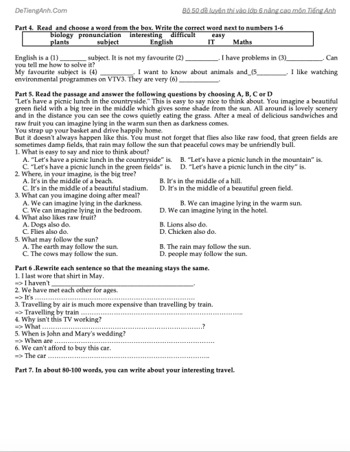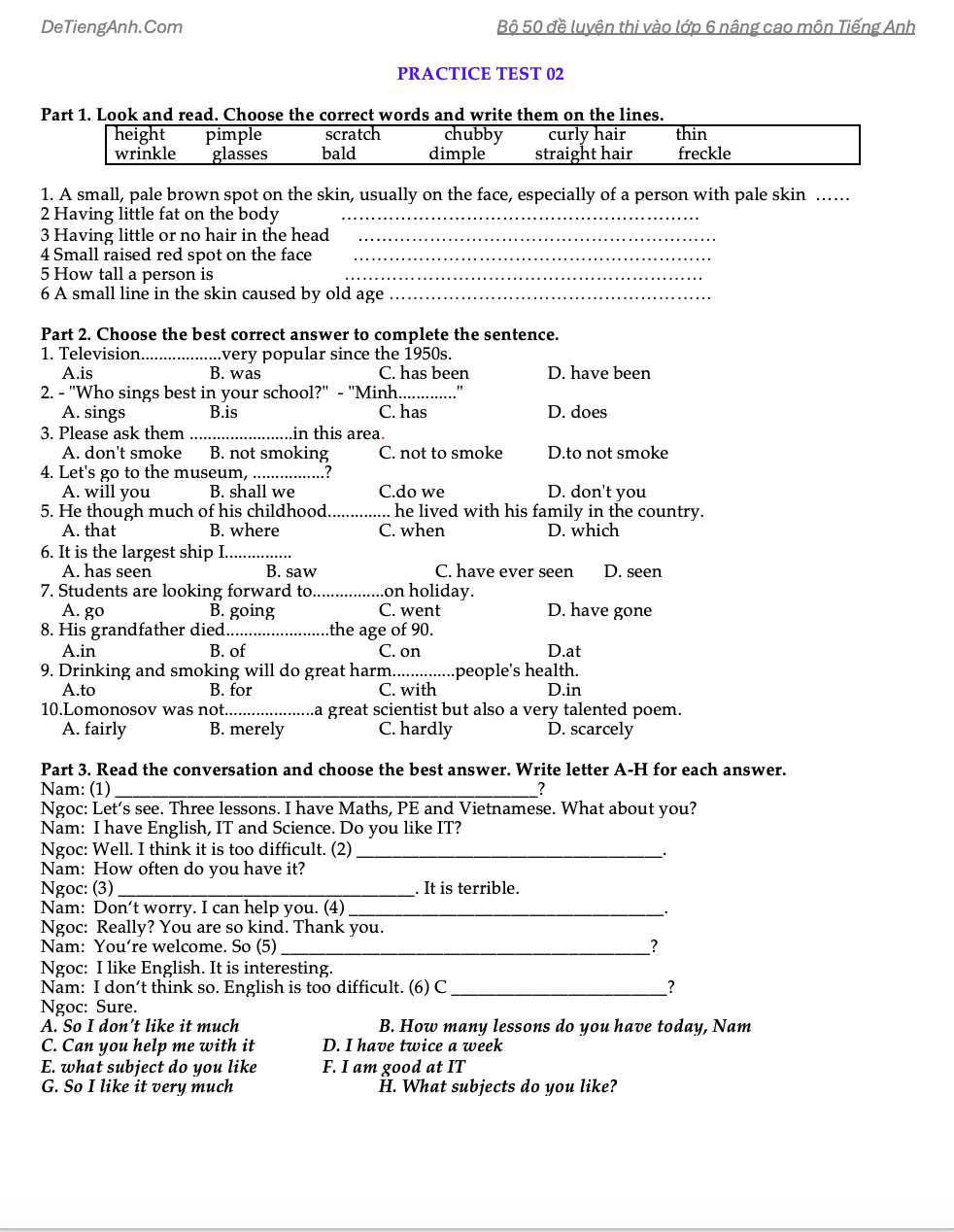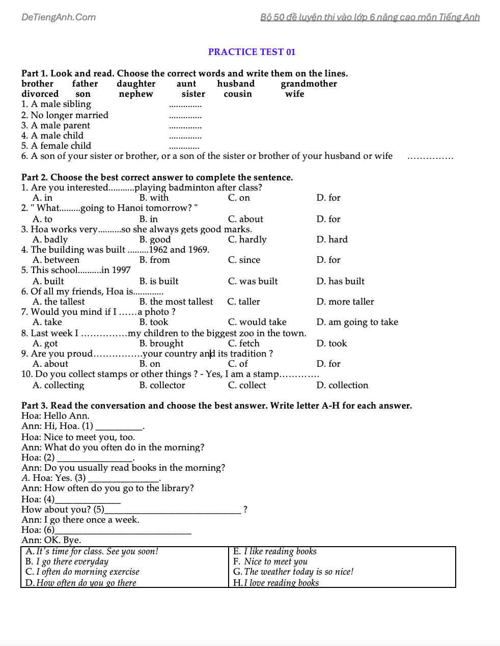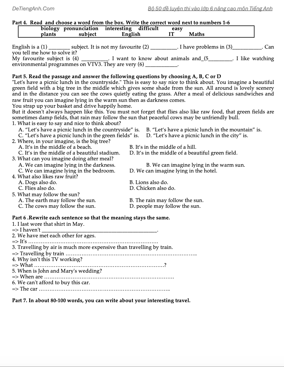 50 Đề Luyện Thi Nâng Cao Vào Lớp 6 Môn Tiếng Anh – File Word – Có đáp án chi tiết